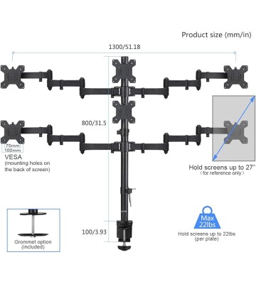 About this item Compatibility - Hex monitor mount ideal for most screens up to 27" and 22lbs each with 75x75mm or 100x100mm backside mounting holes. Fully aticulation - Rotate 360°, tilt ±90° up and down, swivel ±90° left and right (middle plates tilt ±45° up and down, swivel ±45° left and right), extra tall height adjustment along the center pole. Two install options - C-clamp and optional grommet base (fits desk up to 4" thickness) save your valuable desk space. Integrated cable management - Keeps your desk tidy and clean by organizing your power and AV cables in detachable cable clips. Easy installation - Step-by-step user manual and organized hardware kit for hassle free mounting. ..