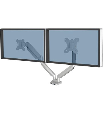 About this item SUPPORTS: Dual monitors up to 32" and 17.6 lbs each, perfect for home, office, or gaming setups GAS SPRING TECHNOLOGY: Fully independent adjustable arms with gas spring technology offer 19.75" reach for increased workspace flexibility and ergonomic comfort EASY INSTALLATION: Quick-Fit VESA plate ensures easy installation on tables or desks using either a clamp or grommet USB PORTS: Integrated USB ports at the base provide convenient charging for your devices while you work FULL MOTION: Full motion adjustability with 360° rotation and +/-45° tilt, plus integrated cable management, keeps your workspace tidy and optimized WARRANTY: Extended 5 Year Limited Warranty ..