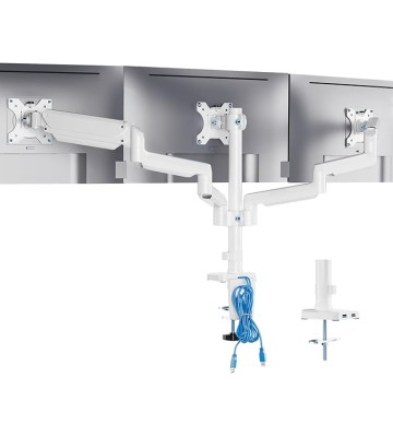 About this item COMPATIBILITY: WALI white brazo para monitor is designed to fit most 13" to 27" screens, supporting screens weighing up to 15.4lbs with VESA mounts of 75x75mm and 100x100mm VERSATILE MOUNTING OPTIONS: The 3 White Monitor Mount offers flexible tabletop mount installation with C-clamp and grommet base options, fitting desks 0.39″–3.15″ thick EFFORTLESS 360° ROTATION: Enjoy complete freedom to position your monitors exactly how you like with 360° rotation. Whether you need a landscape or portrait orientation, the white triple mount's rotation capability ensures seamless transitions for your tasks SMOOTH +/-90° SWIVEL: The +/-90° swivel function enables you to easily adjust three monitors side to side, providing optimal screen positioning for collaborative work or personal comfort. TILT ±45° FOR OPTIMAL VIEWING: The triple monitor stand features +/-45° arm tilt, allowing you to find the perfect angle for each monitor. Height adjustment is up to 17.1", and arm extension is up to 27.2" ..